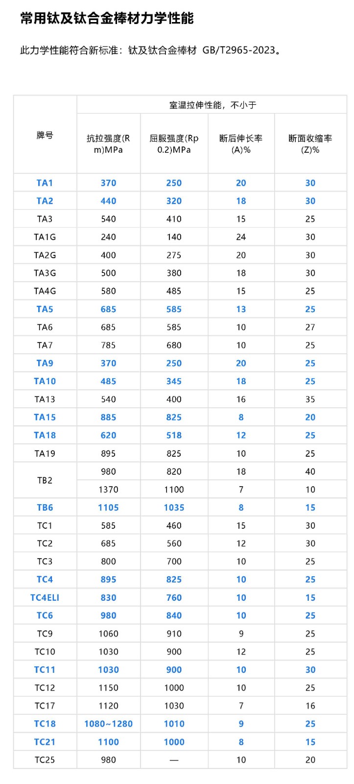 20世紀(jì)50年代以來,鈦及鈦合金因具有優(yōu)異的綜合性能,得到了世界各國的高度重視,在各行各業(yè)獲得了廣泛的應(yīng)用。鈦合金牌號眾多,各種合金各有特點(diǎn),按合金類型主要分為α及近α型鈦合金、α+β型鈦合金和β型鈦合金。介紹各種典型鈦合金的物理性能和力學(xué)性能。